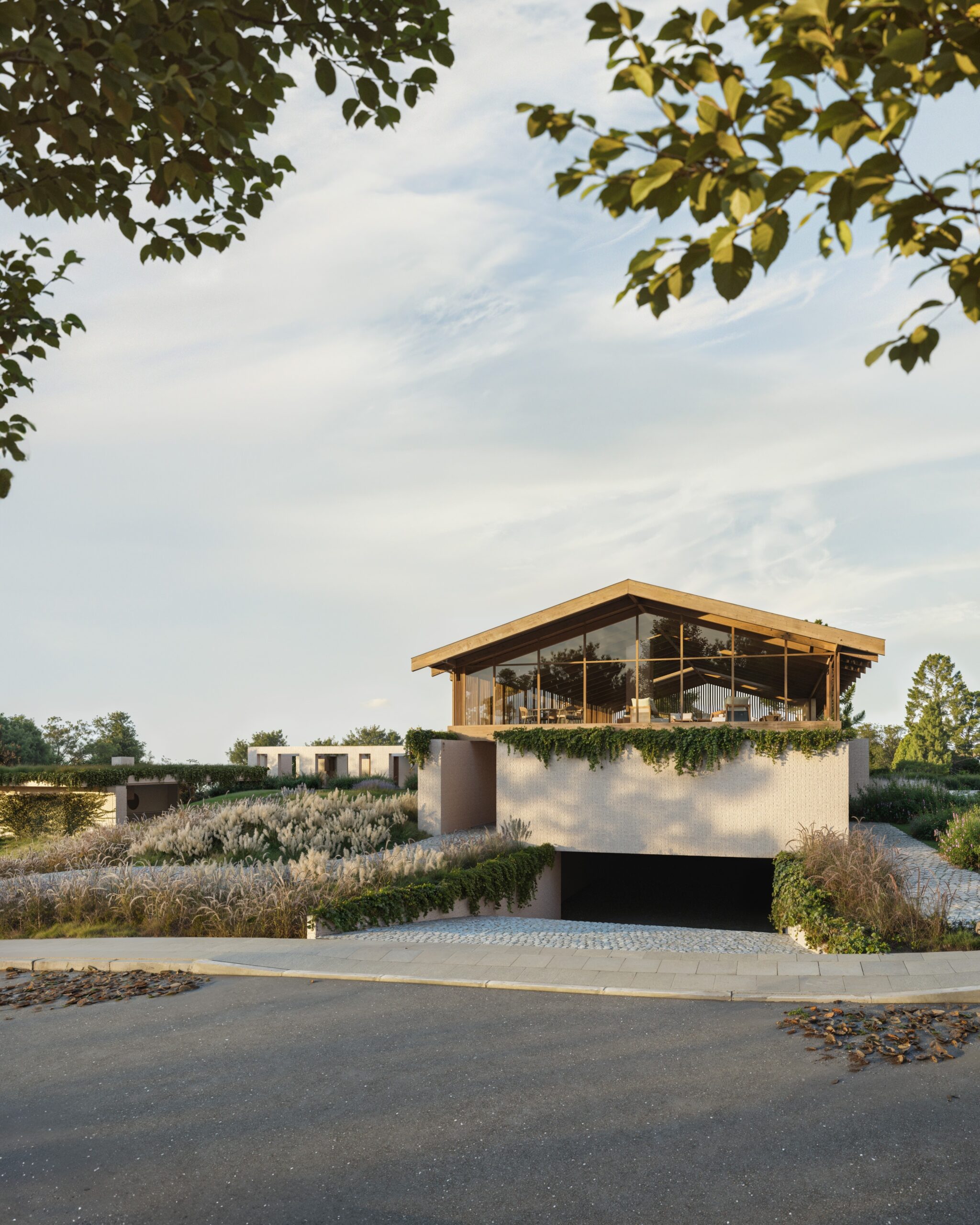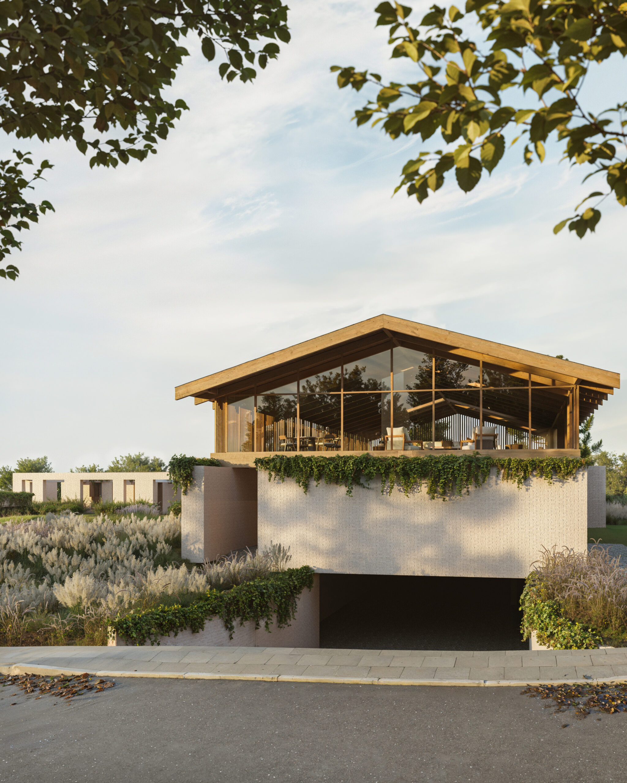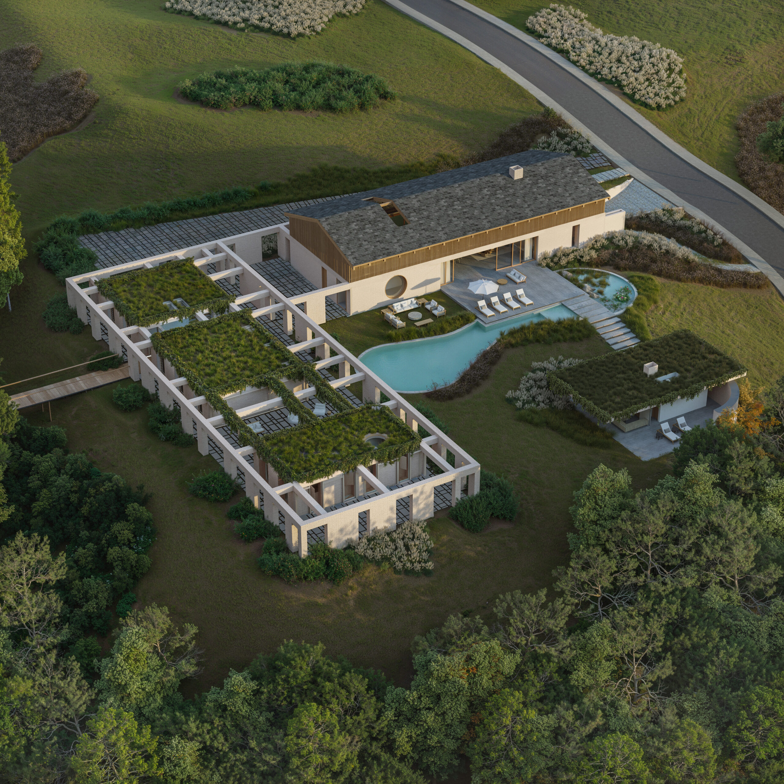 Em contraste, os dormitórios estão organizados em um volume independente, acessado por percursos que funcionam como uma transição suave entre o público e o privado. Esses acessos são definidos por uma estrutura vazada, coroada por uma cobertura verde que, além de contribuir para o conforto térmico, reforça a integração paisagística e a sensação de imersão no ambiente natural. A vegetação sobre a laje filtra a luz, cria sombras móveis e transforma os percursos em verdadeiros jardins suspensos, preservando a intimidade dos quartos sem romper com a leveza do conjunto.