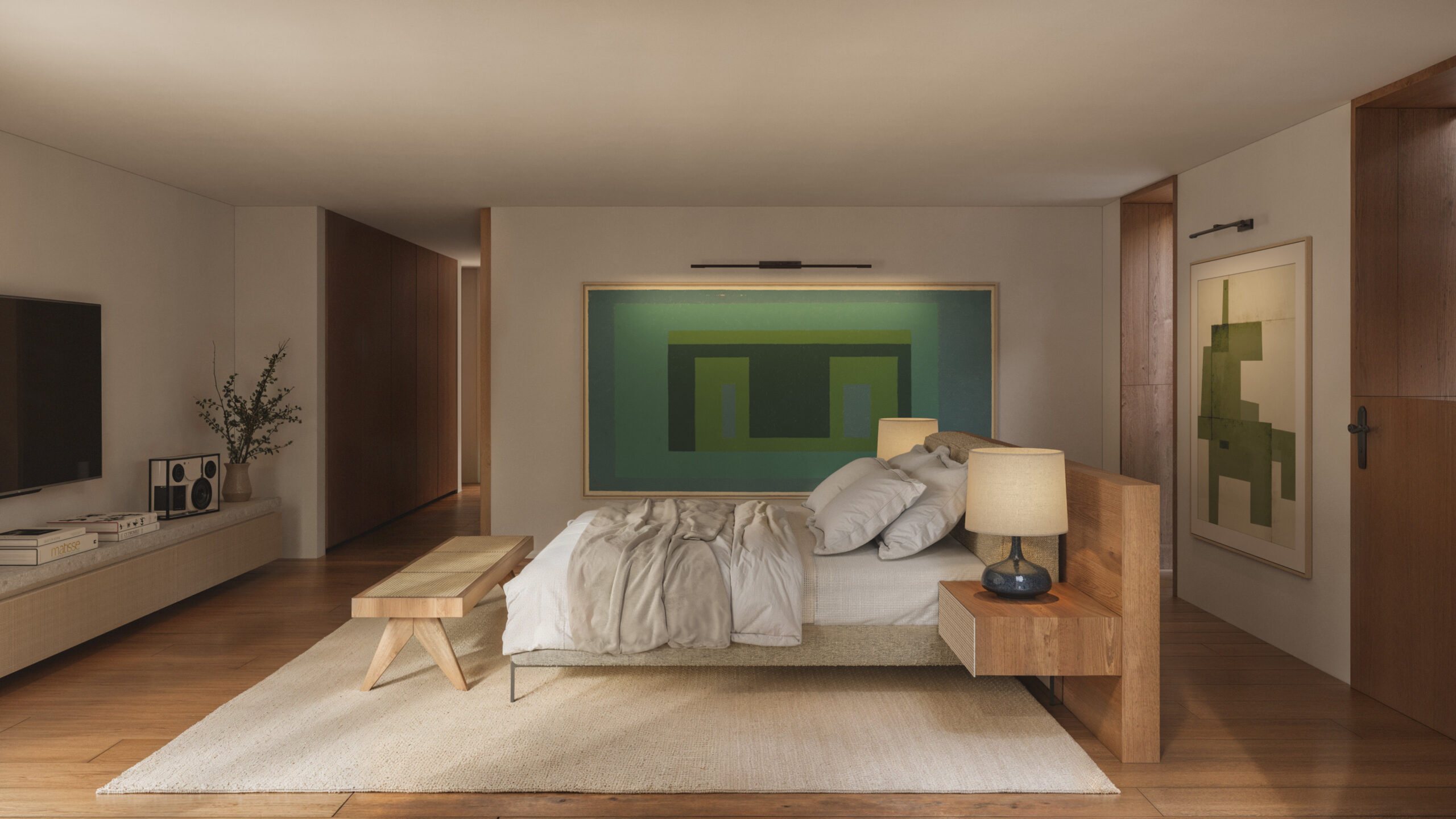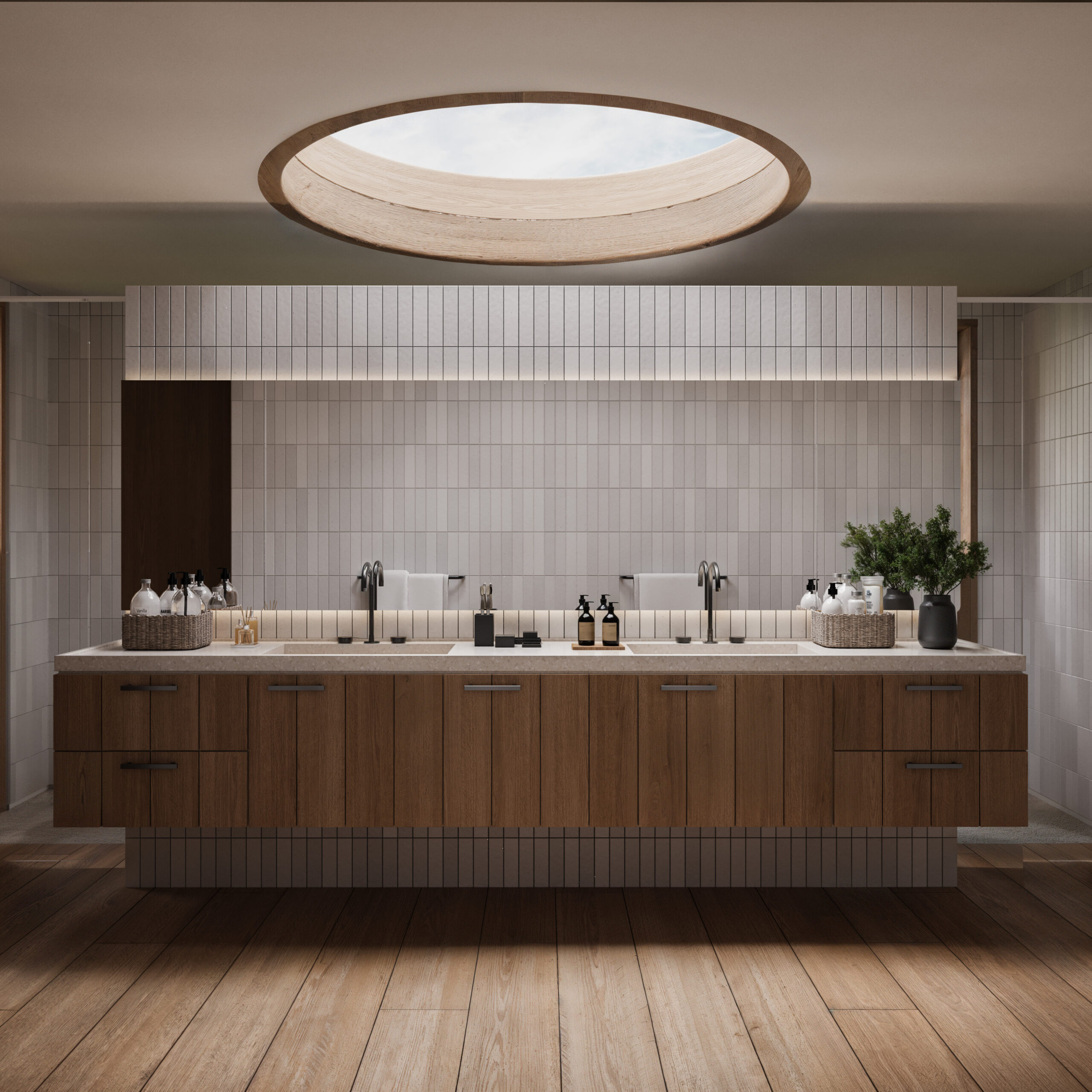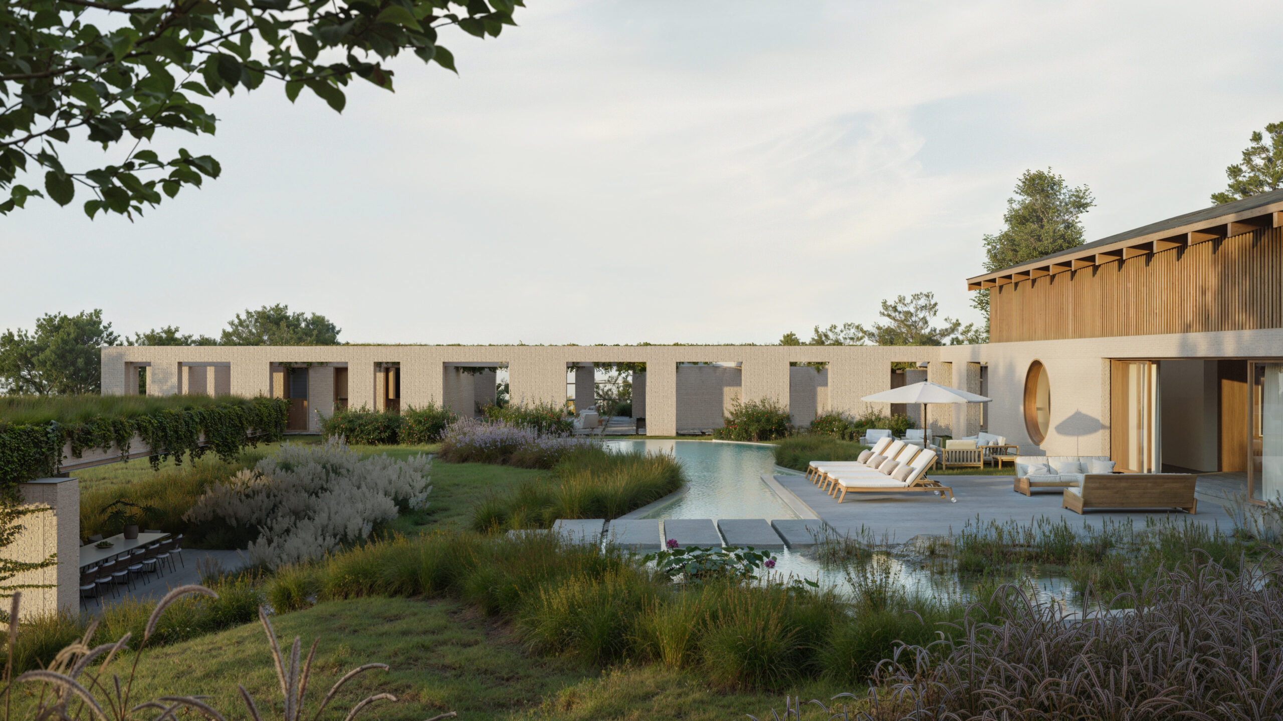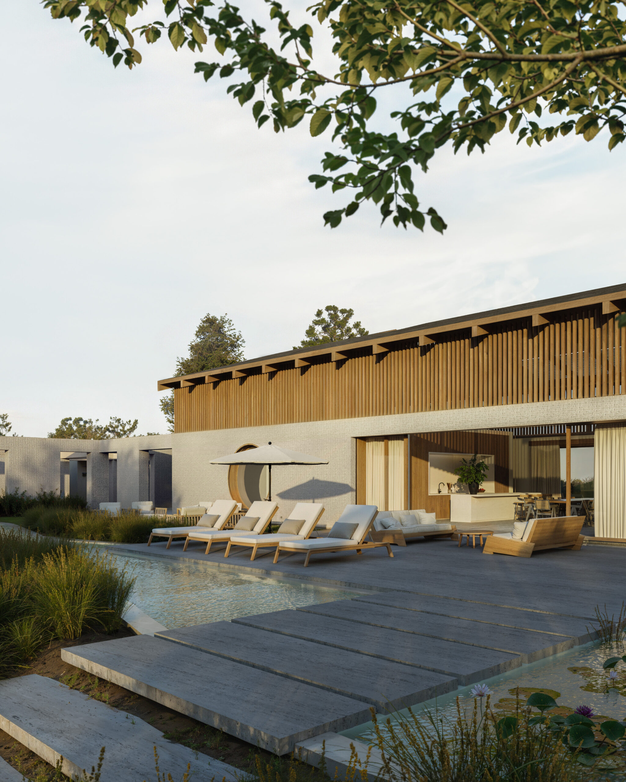 A influência da arquitetura japonesa se manifesta na simplicidade das linhas, na pureza dos planos e na integração fluida entre os ambientes. O uso predominante de tijolos brancos e madeira confere textura, sofisticação e equilíbrio ao conjunto, estabelecendo uma relação harmônica com a paisagem circundante. Elementos curvos são incorporados de forma estratégica para delinear zonas de privacidade tanto nas áreas sociais quanto nas íntimas, suavizando a rigidez dos materiais e promovendo um diálogo entre leveza e robustez.