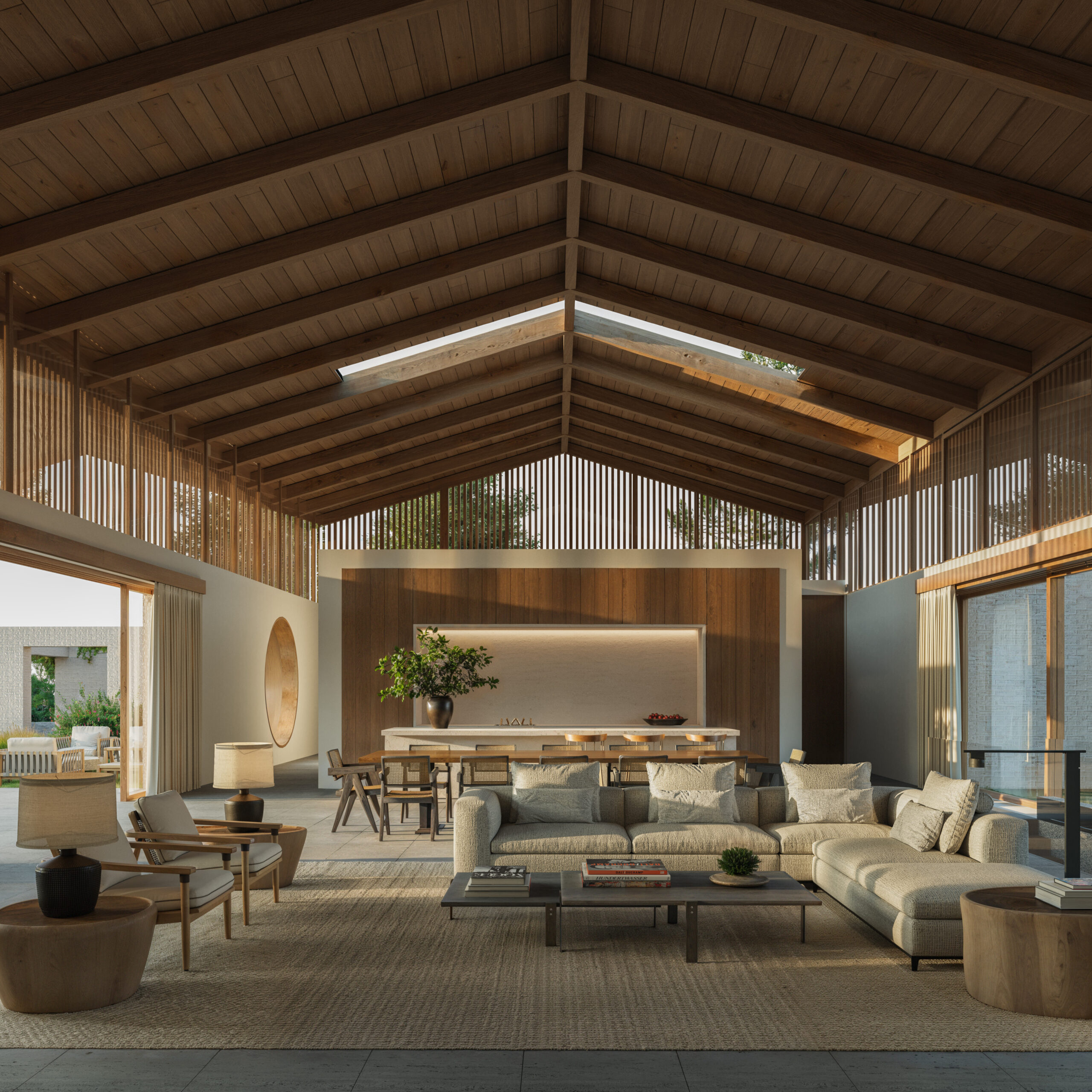 O corpo principal da residência abriga os ambientes sociais, concebidos como um espaço amplo, fluido e aberto, que se estende para o exterior por meio de grandes planos envidraçados. Essa integração permite que a luz natural, o verde e o horizonte façam parte da experiência cotidiana, reforçando a continuidade entre interior e exterior. A área de convivência se articula com a piscina e os espaços de estar ao ar livre, criando uma atmosfera acolhedora, contemplativa e propícia ao convívio.