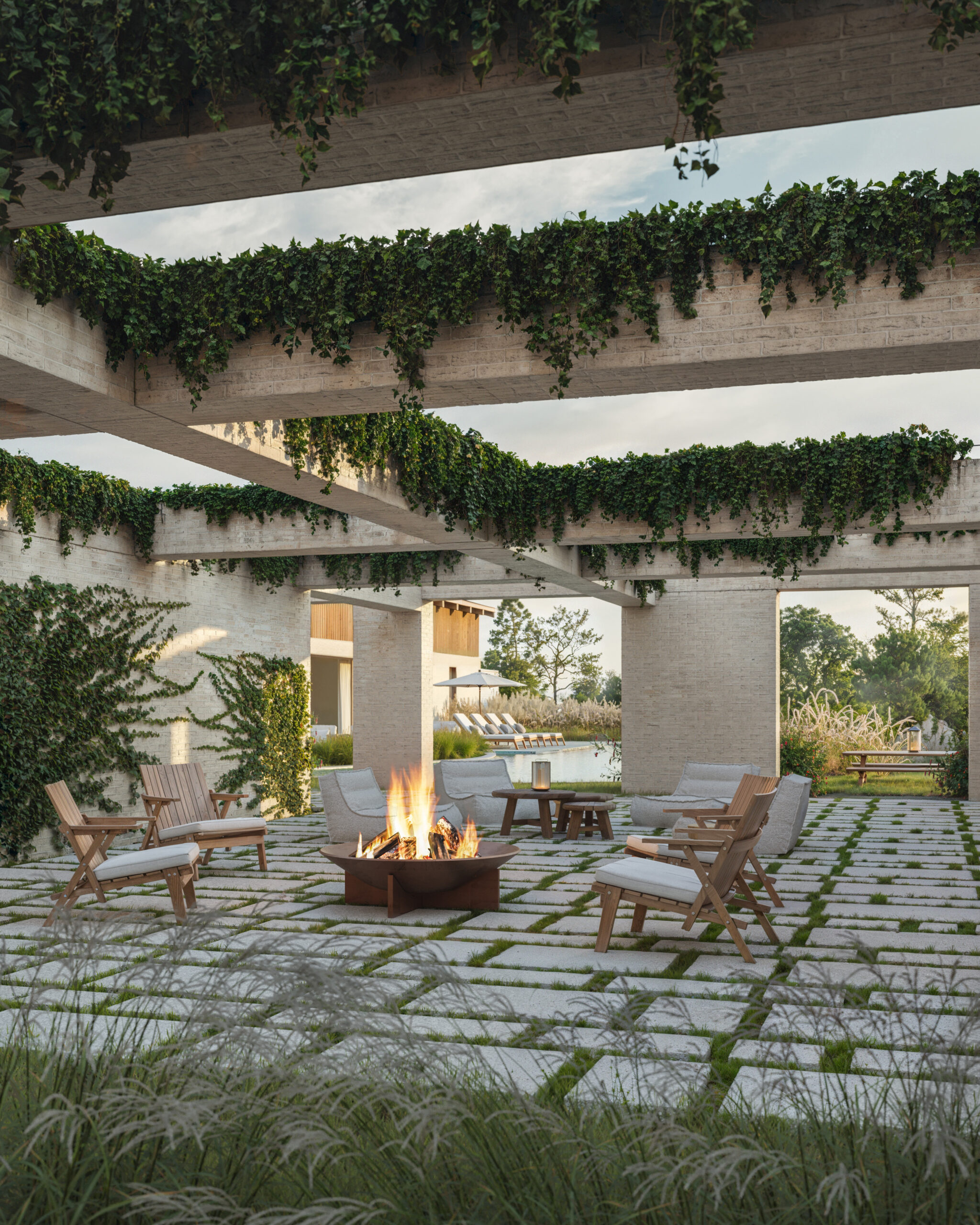 Entre os blocos criam-se espaço de permanência para uma utilização mais íntima, como a lareira a céu aberto.