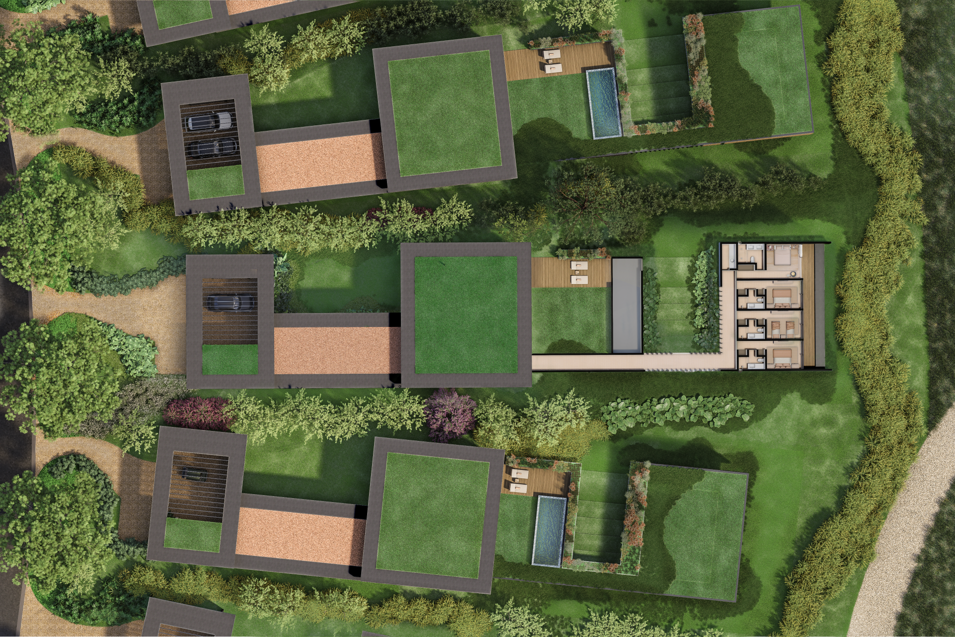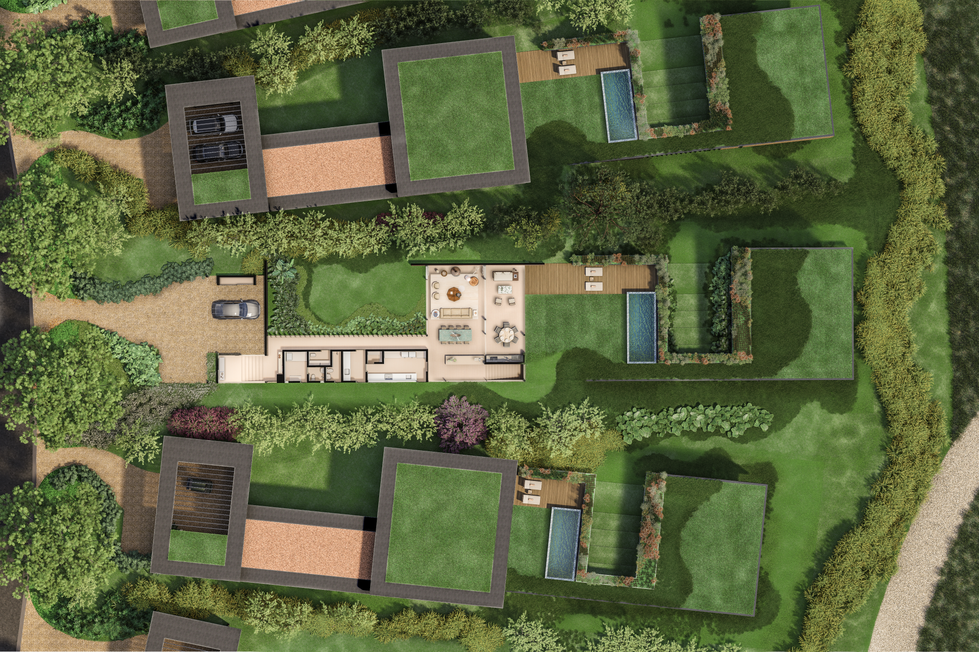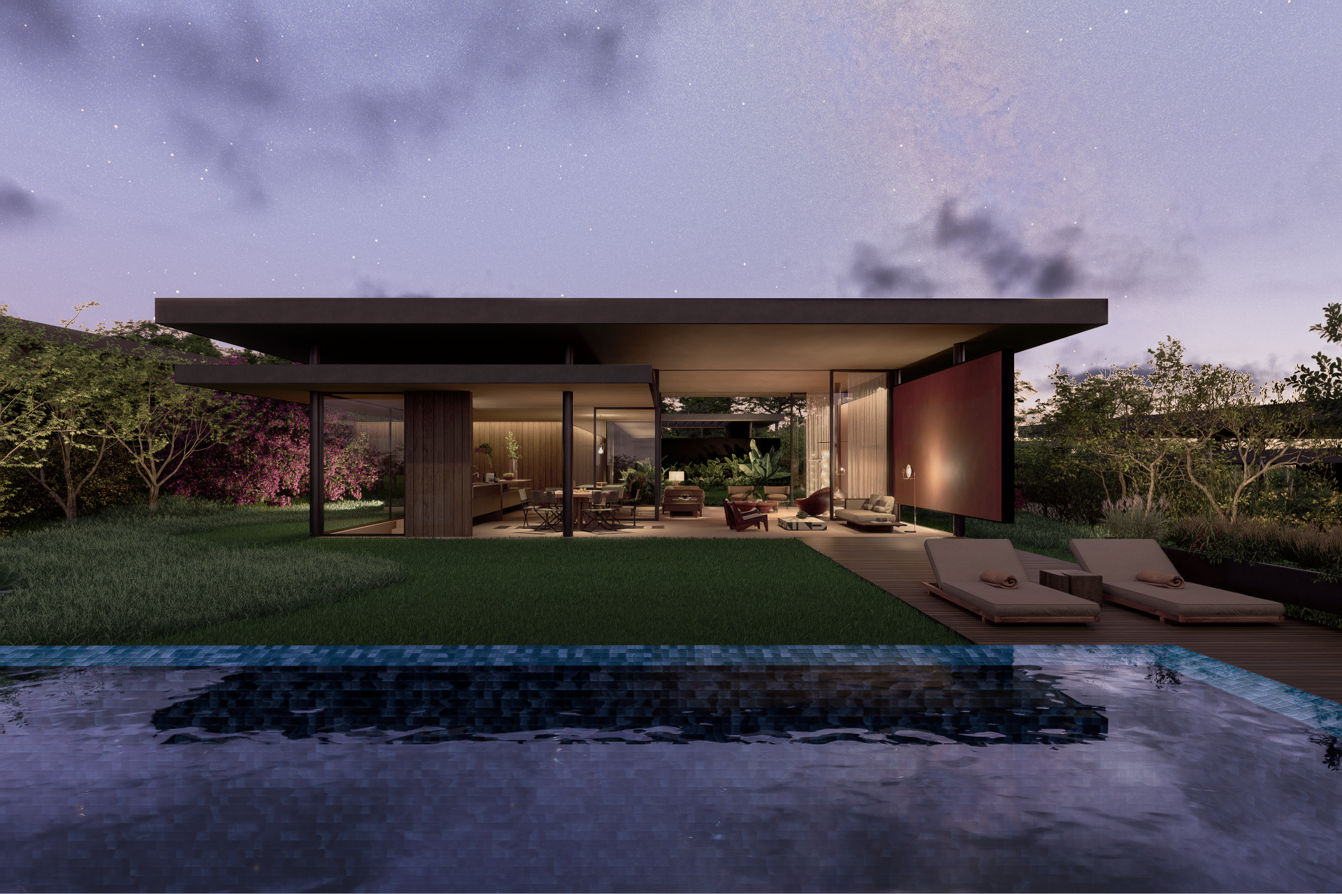 Internamente, os desníveis se refletem em uma setorização fluida dos ambientes. Áreas sociais se abrem para jardins, pátios e espelhos d’água, enquanto os setores mais íntimos se acomodam em níveis mais resguardados, sempre com vistas privilegiadas da paisagem. Caminhos externos, pergolados e áreas verdes costuram os diferentes volumes, transformando a circulação em uma experiência de percurso pela natureza.