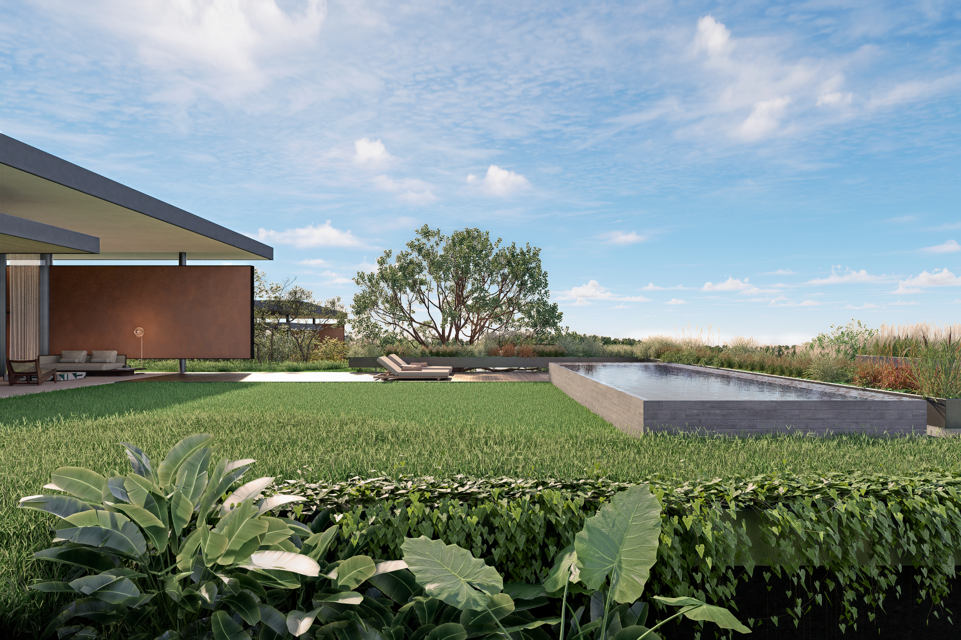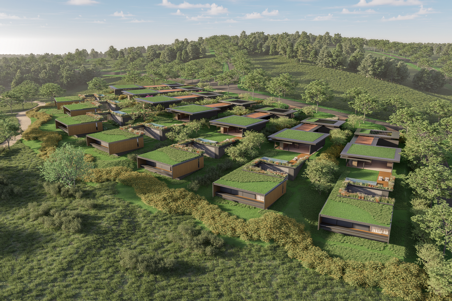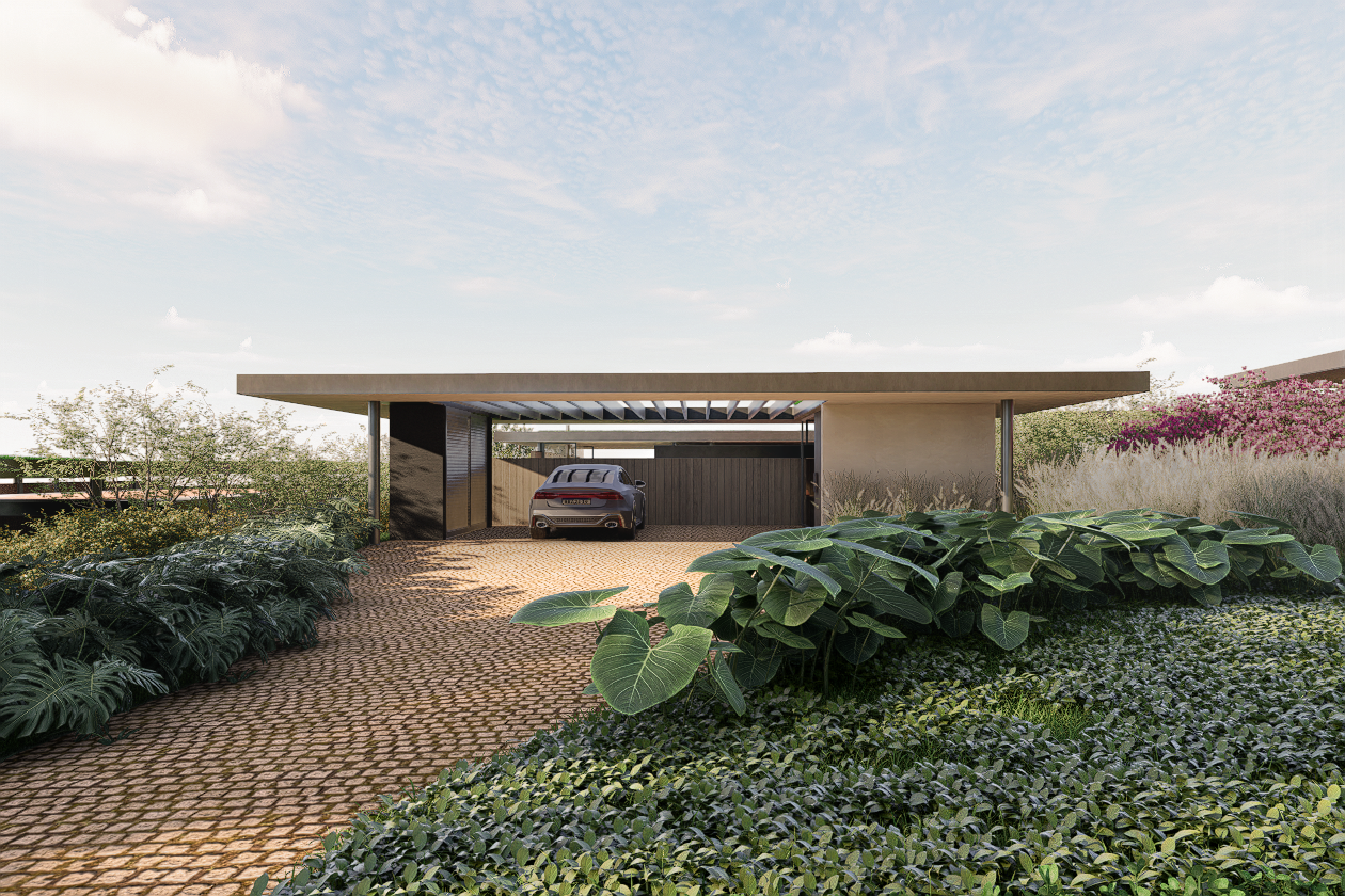 Inserida no contexto do empreendimento Fazenda Vista Verde, a casa dialoga diretamente com a proposta maior de valorização da natureza, do silêncio e da paisagem. Os volumes baixos e alongados se dispersam no terreno como extensões do próprio campo, preservando vistas, respeitando a vegetação existente e garantindo privacidade sem a necessidade de barreiras rígidas. A relação entre construído e natural é constante: jardins, pátios, coberturas verdes e grandes aberturas fazem com que o interior esteja sempre em contato visual e sensorial com o entorno.