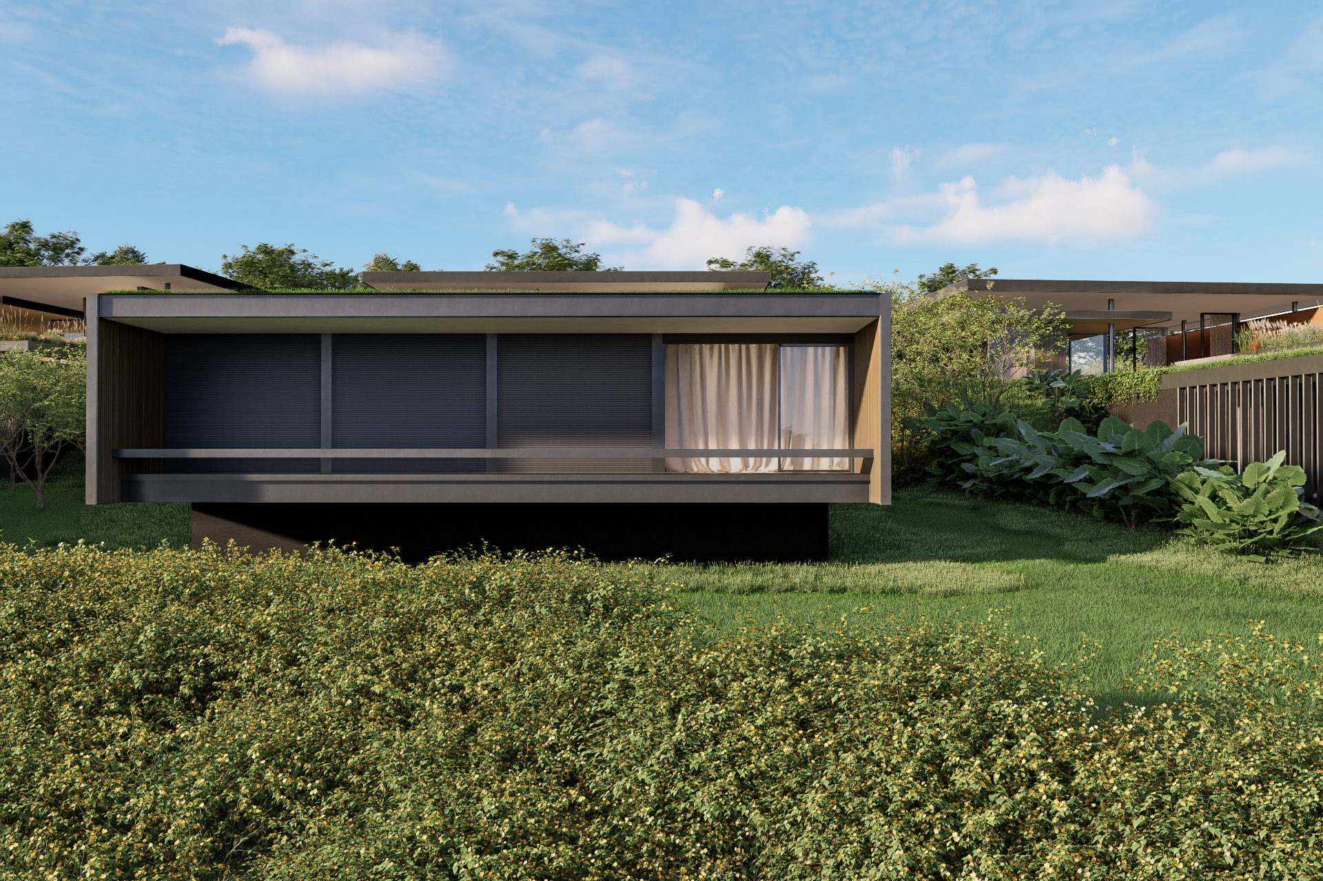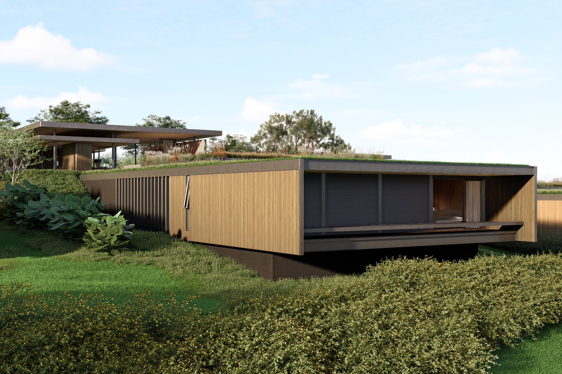 Os telhados verdes têm papel fundamental nessa integração. Além de contribuírem para o conforto térmico e para a retenção de águas pluviais, eles reforçam a leitura da casa como parte do relevo, quase como se os volumes emergissem do próprio terreno. Em alguns pontos, os planos de cobertura se prolongam em grandes beirais, criando áreas sombreadas, varandas e espaços de transição que diluem o limite entre interior e exterior.